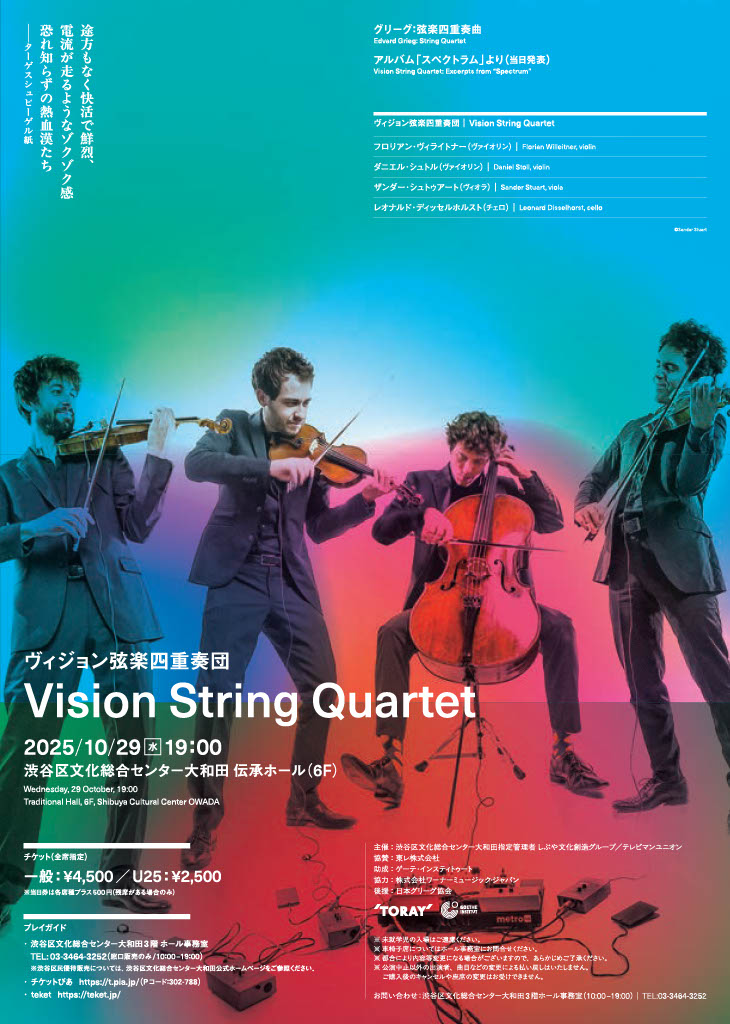 世界的に注目を集めるドイツの若手弦楽四重奏団「ヴィジョン弦楽四重奏団(Vision String Quartet)」が10月29日、東京・渋谷区文化総合センター大和田伝承ホールでコンサートを行う。